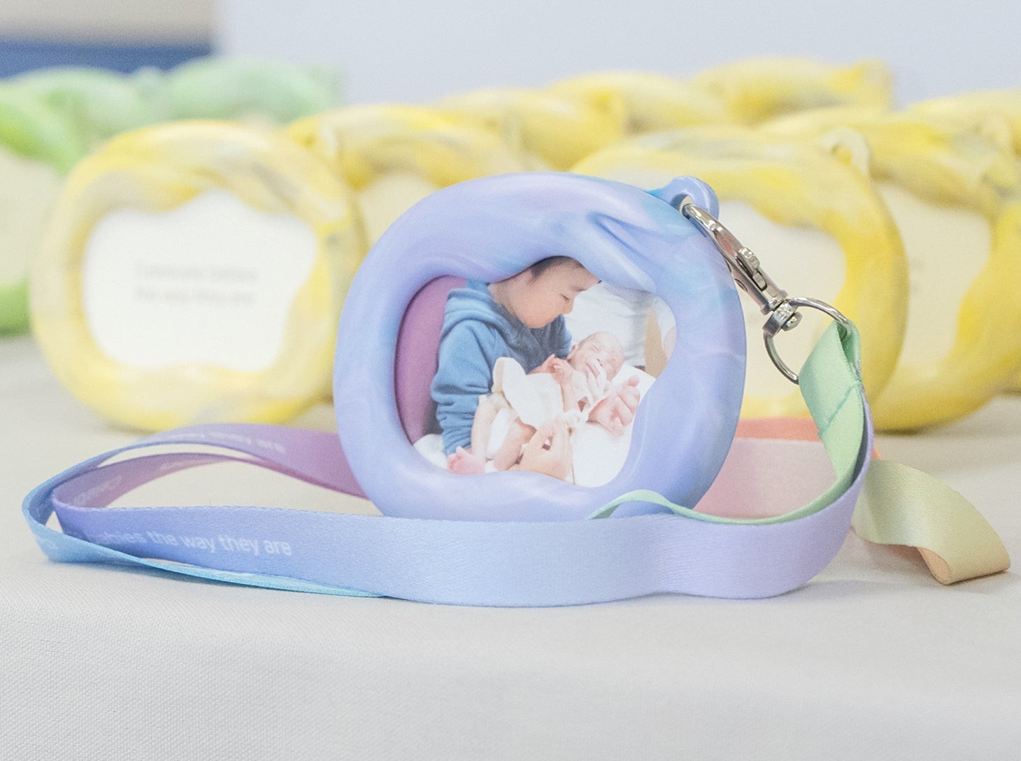 NICUを退院されたお子様とそのご家族の頑張った日々を称え、過ごされた日々を振り返るきっかけとなる「Celebrate baby medal」を贈呈しています。このメダルは、ピジョンのプラスチック製品の製造過程で発生する、未使用の製品をアップサイクルしたものです。1つ1つ同じものにはならないマーブル模様は、1人1人が特別な存在である赤ちゃんとそのご家族を表しています。また、フォトフレームとして飾ることもでき、「ご家族の思い出にそっと寄り添いたい」という想いも込められています。