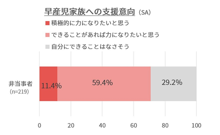 一方で、早産児ご家族への支援に関して「積極的に力になりたいと思う」(11.4%)、「できることがあれば力になりたいと思う」(59.4%)と回答した非当事者は約7割であり、支援意欲の高さが明らかとなりました。