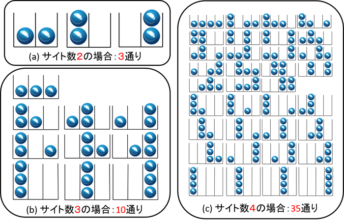具体的に、隣り合う2つの容器を考え、そこに2つの原子を入れるという状況を考えます。隣り合う容器の間で原子が飛び移れるようにすると、図1(a)で示すように、左右の容器に1つずつの状態(左)、左の容器に2つの状態(中)、右の容器に2つの状態(右)の3通りの状態が考えられます。量子力学によれば、一般的な状態というのはこれらの状態がある確率振幅(確率振幅の絶対値自乗が実現確率)で重ね合わされたもので、未来においてそれぞれの確率振幅がどのように変化するかはシュレディンガー方程式を解くとわかります。図1(a)で示した場合のように、系が取りうる状態が3通りだけであれば、コンピュータを使って簡単にシュレディンガー方程式を解くことができます。図1(b)で示す3つの容器に3つの原子を入れる場合は、系が取りうる状態は10通りであり、この場合も問題なくコンピュータで解けます。図1(c)で示す4つの容器に4つの原子の場合(35通り)もまだ解けます。しかしながら、容器の数と粒子の数を簡単のためどちらもNとすると取りうる状態の数は(2N - 1)!/((N -1)! N !)となり、Nが増えると爆発的に増大します。例えば、N=30ですでに状態の数はおよそ6×10^16通りになり、10^17バイト程度のデータ量になってしまいます。これは理化学研究所が開発中のスーパーコンピュータ「富岳」でも扱えないデータ量です。このように、構成要素数が増えると扱わなければならないデータ量が爆発的に増えるという性質のために、量子多体系の正確なコンピュータシミュレーションは現実的には不可能なのです。