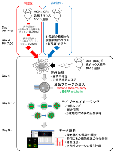 近畿大学生物理工学部(和歌山県紀の川市)遺伝子工学科教授 山縣一夫と、扶桑薬品工業株式会社(大阪府大阪市)、医療法人浅田レディースクリニック(愛知県名古屋市)らの研究グループは、不妊治療時に女性患者に対して行うホルモンなどの排卵誘発剤※1 投与が、受精卵そのものの染色体分配※2 や発生の速さに大きな影響を与えないことを、マウスを用いたライブセルイメージング技術※3 により明らかにしました。本研究により、排卵誘発剤を用いることで、より多くの品質が高い卵子を得られることが分かり、長年議論されてきた排卵誘発剤投与の可否について一石を投じる成果となりました。