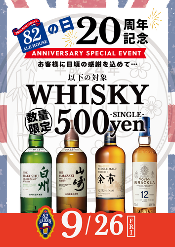 株式会社ハブ(本社:東京都千代田区、代表取締役社長:太田 剛)が運営する英国風PUB「82」は、2005年9月の82神田店オープンを皮切りに、今年でブランド誕生20周年を迎えます。これを記念し、82神田店のオープン日である9月26日を「82(エイティトゥ)20周年の日」とし、82全店にて、対象のウィスキーを数量限定・特別価格で販売いたします。さらに、20周年を彩る毎月の特別企画もご用意しております。ぜひこの機会に「82」へご来店いただき、英国PUBの雰囲気とともに、特別なひとときをお楽しみください。