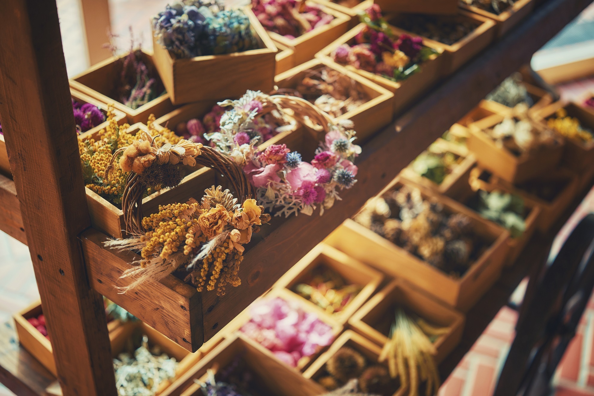 神戸布引ハーブ園で大切に育て、四季折々多くのお客様にご覧いただいた花やハーブが素敵なドライフラワーになって登場します。