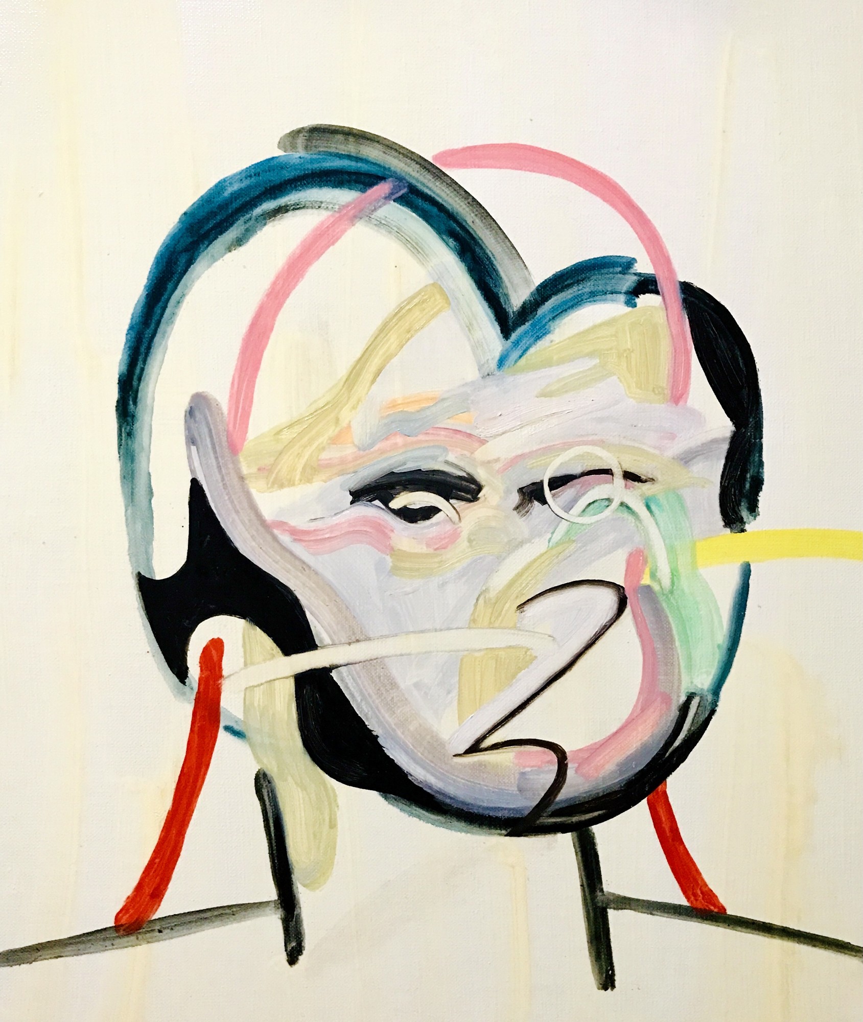今回の展示では下書きやラフもなく、キャンバスに直接絵の具を重ね偶然生まれる形や筆跡から描き始めるかたちをとっています。その過程で人の顔のようなものが浮かび上がります。それは明確に描こうと決めているものではなく、抽象的な形から拾い上げられた「顔らしきもの」です。画面の中に現れたり消えたりするかたちを追いかけるように描くプロセスは人の顔というルールをさらに拡張してくれるように感じます。日常の景色や身の回りには、顔のように見えるかたちがあふれています。制作の中で現れたり消えたりする形を追いかける行為は、人の顔を描くというルールを拡張し、新しい可能性を示してくれるように思います。