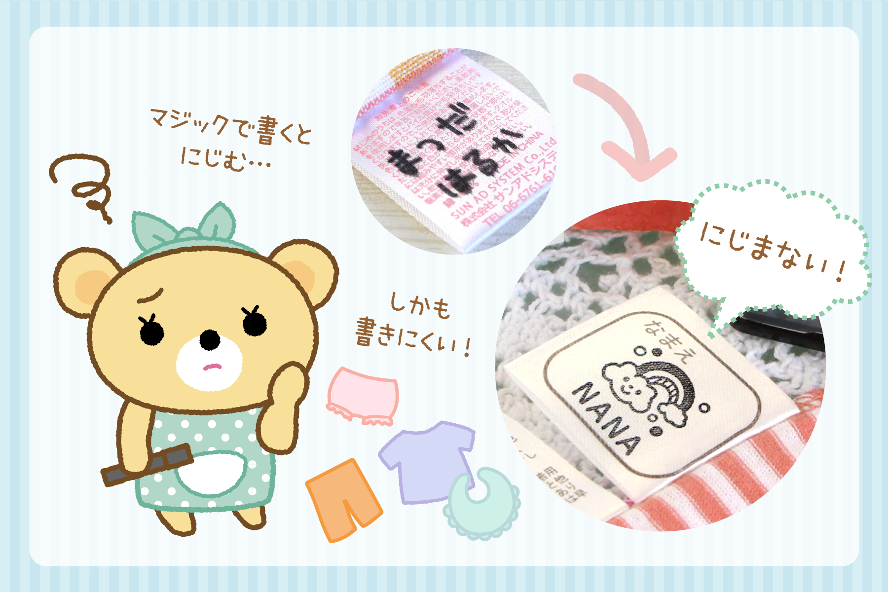 【商品詳細】にじみにくい油性インクで、手書きで書きにくい洗濯タグにキレイに名前つけ