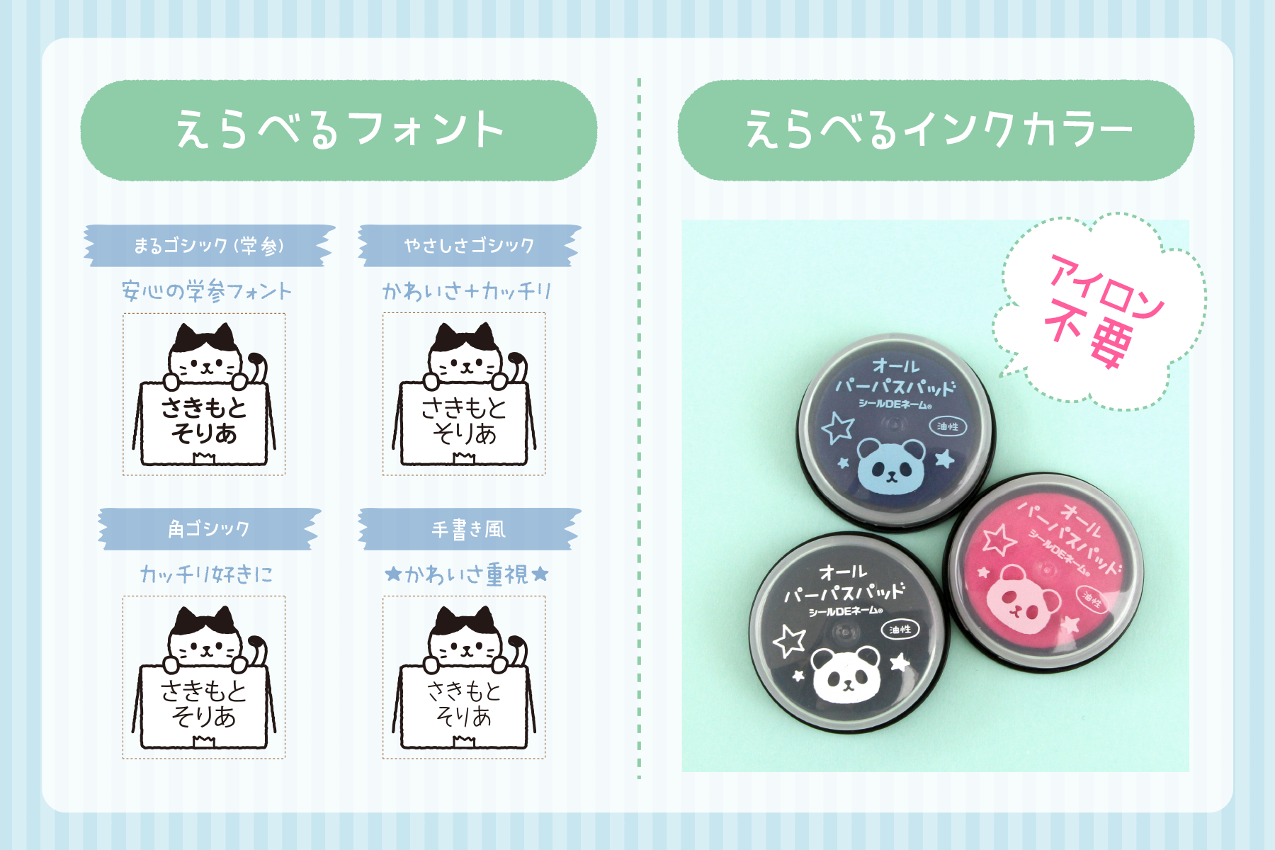 学参・旧字に対応した「丸ゴシック」からかわいい「手書き風」まで、全4種類のフォントから選ぶことができます。また、ひらがなだけではなく漢字やローマ字にも対応。付属のインクカラーも3色ご用意しておりますので、洗濯タグで目立つよう「ブルー」や「ピンク」のセレクトもオススメです。