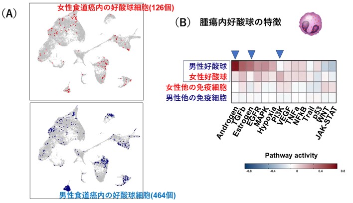 今回、共同研究グループは、まれではあるが最近増加傾向にある女性非喫煙者の食道扁平上皮がんを対象とし、20例のがん組織の全ゲノムRNAシークエンス解析[2]を行い、その変異シグニチャー[3]を一般的な男性喫煙者の食道がんのデータ(74例)と比較しました。その結果、原因変異遺伝子については差異がないものの、加齢と関連する変異シグニチャーが多い傾向にありました。腫瘍内の免疫細胞の活動性を調べると、女性食道がん組織内には、活動性の高い免疫細胞が観察され、特に好酸球[1]が多く検出されました。男女計4例の食道がん組織から免疫細胞を抽出し、その内約31,000個の単細胞(シングルセル)RNA解析[4]を行うと、女性食道がんにおいては好酸球が活性化していました。