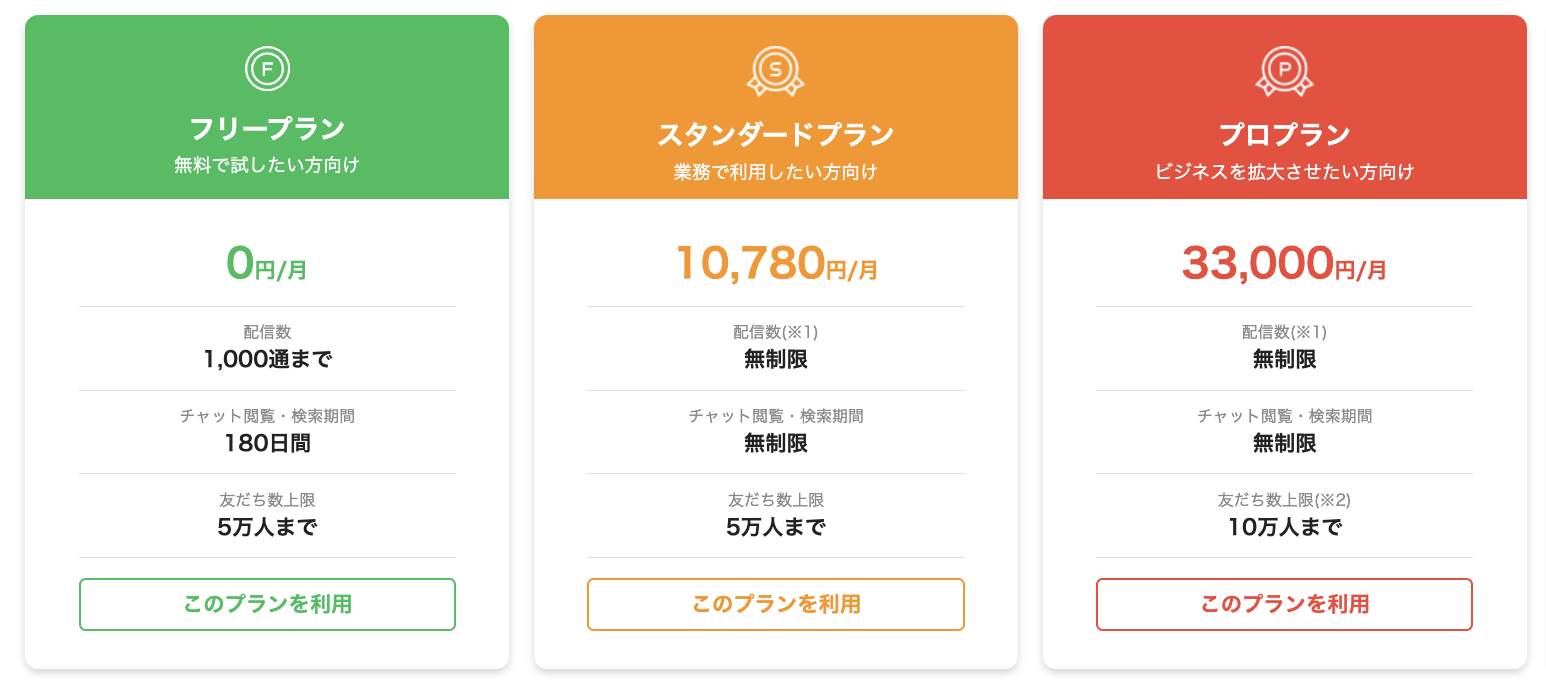 L Message(エルメッセージ)は、無料で使えるフリープランから大規模アカウント向けのプロプランまで、企業規模や用途に応じた3つの料金プランを展開しています。