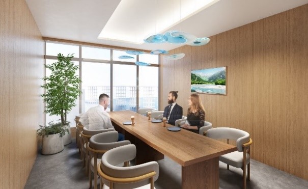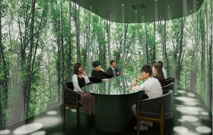 個室に入室した時は、屋外の空気環境が描かれており、徐々に室内の空気環境を反映した清々しい高原の絵画に変貌します。目に見えない空気の情報が生成AIによりアートへ変貌する最先端の技術を体感いただけます。