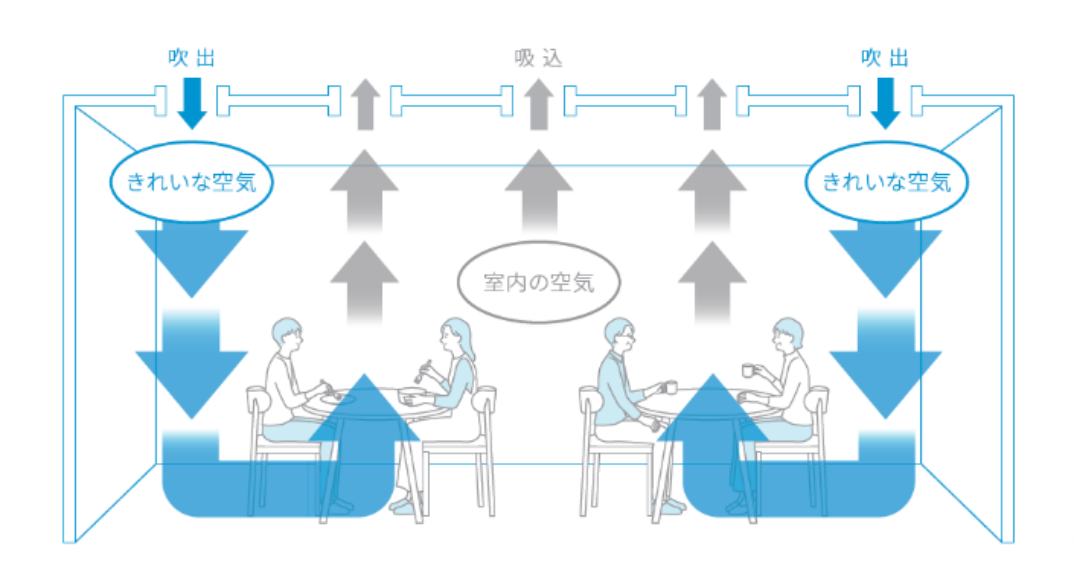 「天井吹出型の置換換気空調」は、快適な温度や湿度に調整された空気を天井からフロアに向かって低速で落下させ、ウイルスなどの粒子状物質やVOC※3などのガス成分を含んだ空気を効率よく天井面に押し上げて排気する新しい空調システムです。エアコン特有の横風を感じさせない、心地良い涼しさをお届けします。