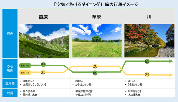 「空気で旅するダイニング」は、空調制御と映像・音響刺激を組み合わせることで、未来の空気体験を可能にする個室です。ダイキンが得意とする温度・湿度・気流のコントロール技術と、東京大学の視聴覚に関わるクロスモーダル技術を掛け合わせることで、実在する心地よい空気が感じられるスポットを個室内に再現します。個室の壁いっぱいに高原や草原を映し、その景色に調和した空気環境と環境音を合わせることで、まるで自然の中で食事をしているような体験ができます。