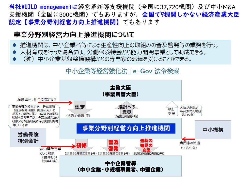 株式会社VUILD managementは、中小企業等経営強化法第26条に基づき、経済産業大臣から認定された「事業分野別経営力向上推進機関」(全国で9機関のみ)であり、中小企業に精通した専門機関として「中小企業の本気の賃上げ」実現の為に直接政府及び省官庁に提言書提出等の活動をしています。