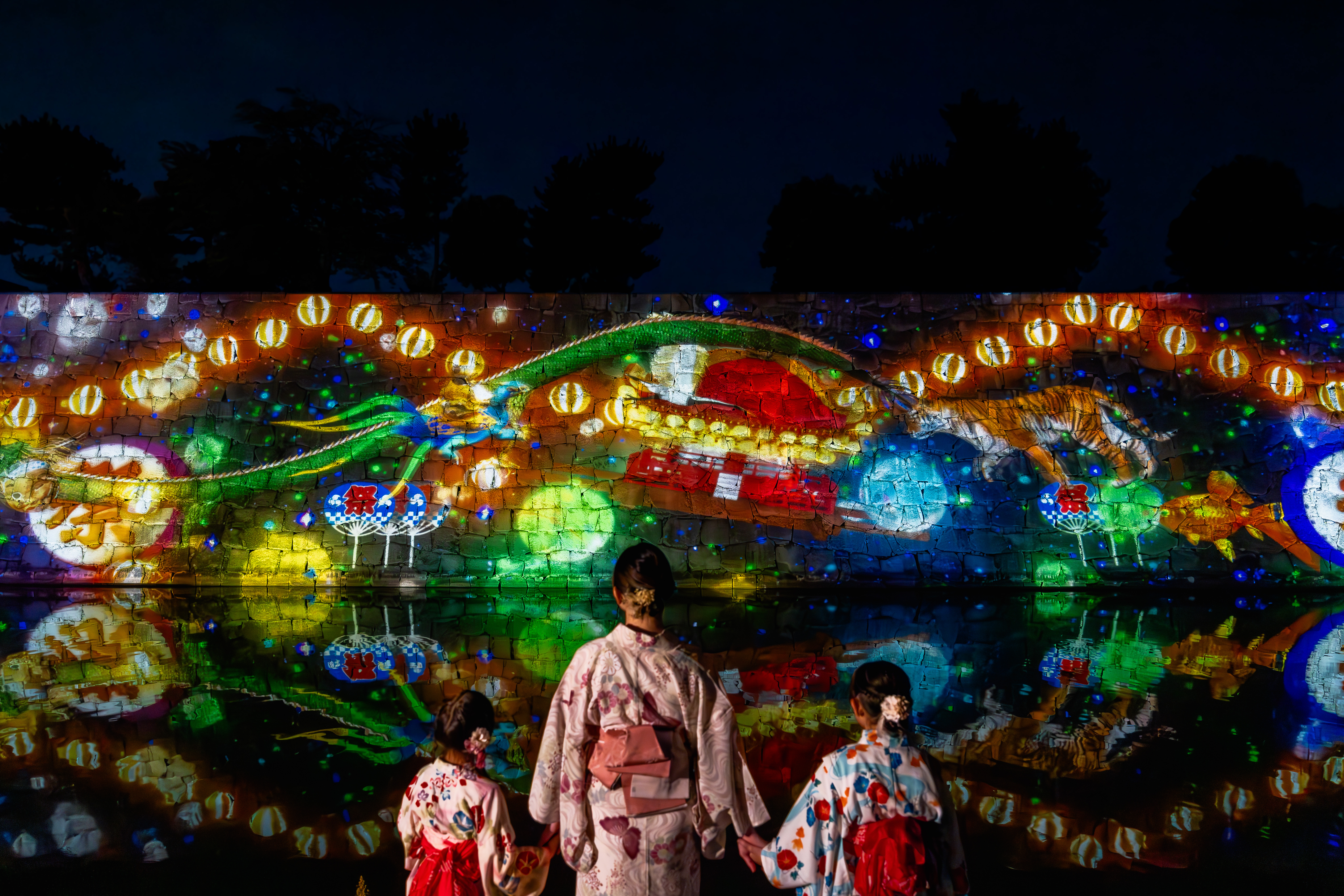 夜の美しい二条城を、プロジェクションマッピング花火や、涼やかな風鈴の音色が広がる天の川ライトアップ、縁日屋台のデジタルアートが彩ります。