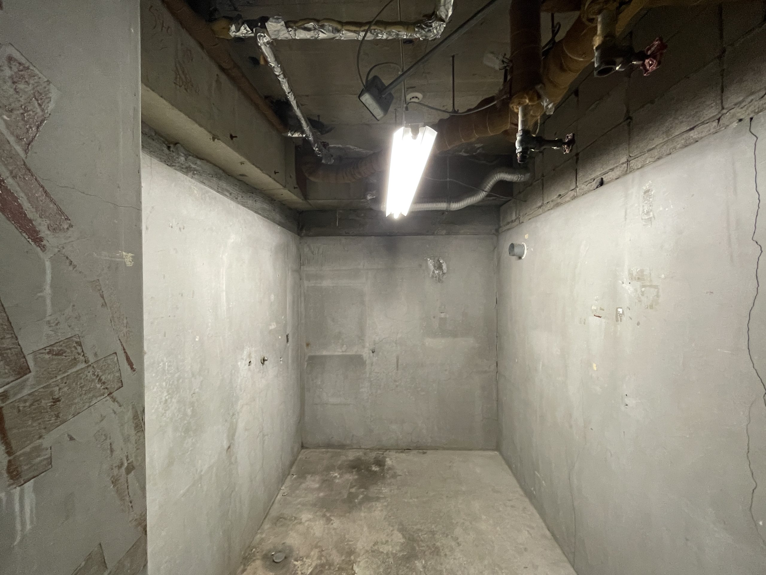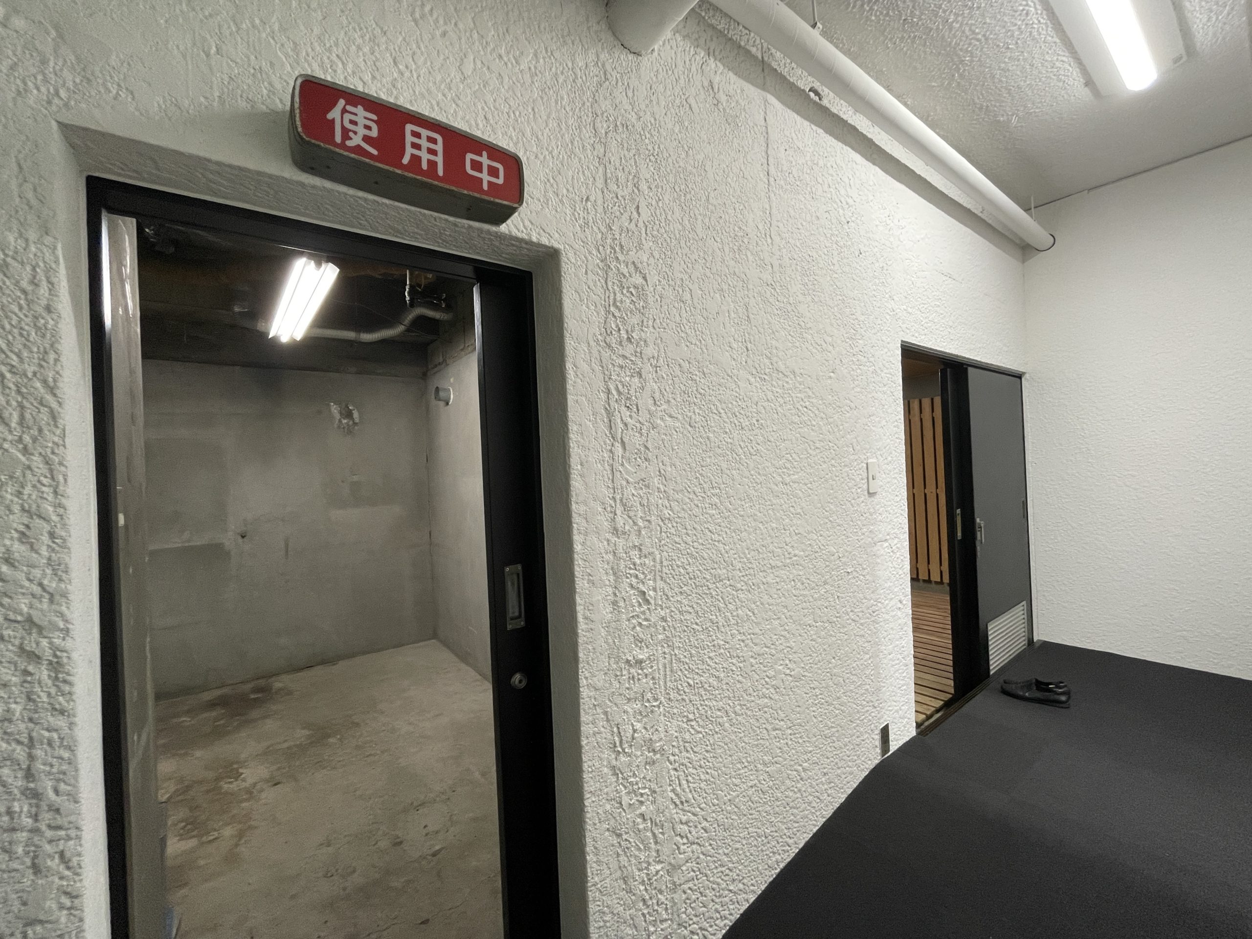 元々駐車場だったところを改装して出来上がったお部屋。地下といっても窓から日が入ってくるので閉塞感がない。一見スタンダードに見えるが、天井の配管がいい雰囲気だから床のカーペットを変えればぐっと個性的な空間に変わるだろう。「使用中」のランプがついている空間は、元々写真室として使われていた。使用するには別途契約が必要だが、なんだかおしゃれな個室として使えそう。建物前のスペースを駐車場として使用したい場合は相談可能。