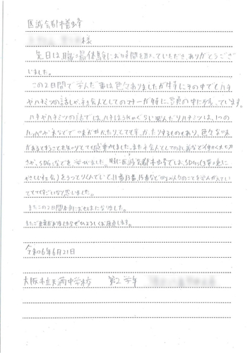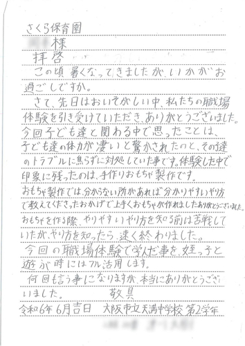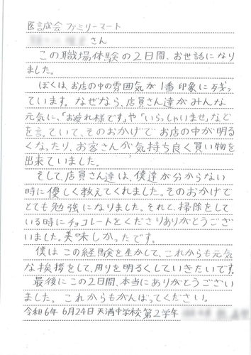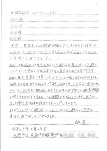 医療法人医誠会では、生徒たちが患者さんの立場ではなく病院スタッフとしての立場を体験し、新鮮な気持ちで業務に挑むことを期待しています。今回の職業体験学習では、看護部を体験した生徒から「医誠会国際総合病院の優しい方々のおかげで楽しく職場体験学習を終えることができました。日頃から興味のあった病院での仕事を体験することができて、とてもためになりました。」など、感謝の手紙が届いています。リハビリテーション部では「ふだん自分が走ったり計算をすばやくすることはあたりまえじゃないと改めて分かった2日間でした。」という声が寄せられました。