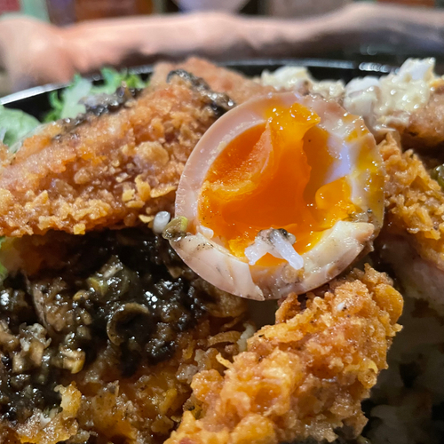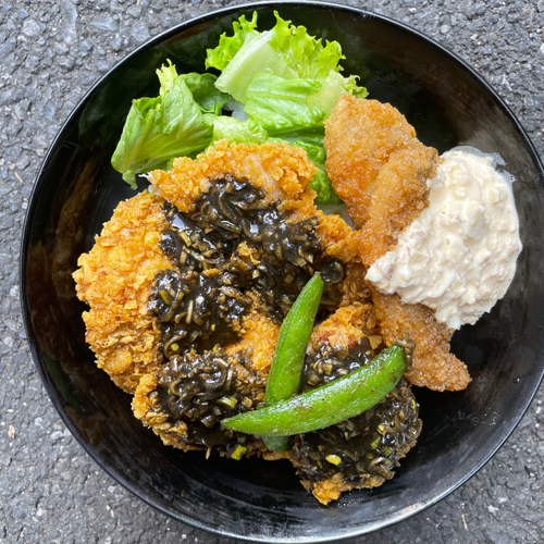 ザクザクコーンフレークの衣と濃厚黒胡麻ソースの人気丼!アジフライも付いていて相変わらず美味い唯一無二の味です。