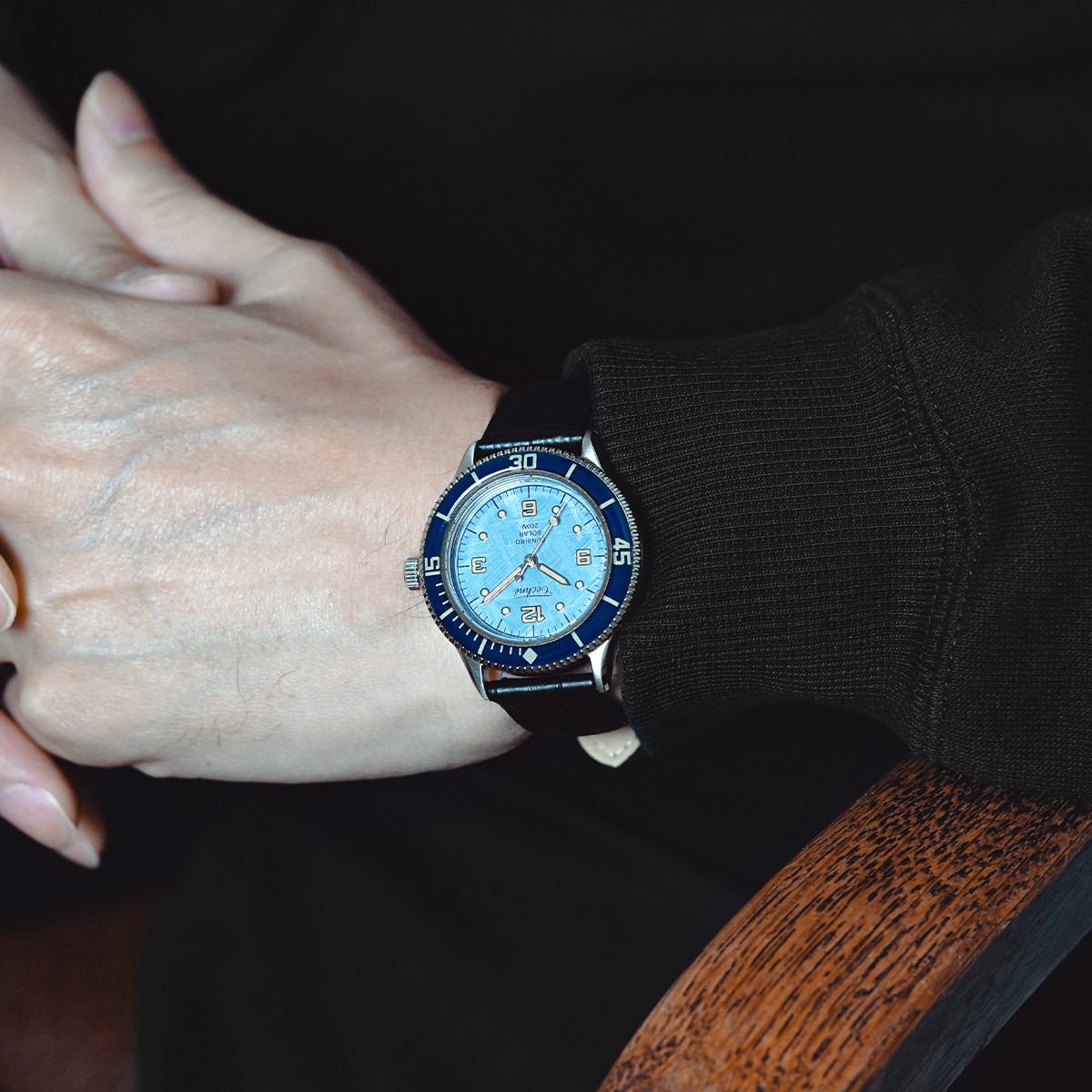 ネイビーモデルは、深海を思わせる落ち着いた色調の中に、メテオライト特有の結晶模様が静かに浮かび上がる仕上がり。ヴィンテージダイバーズの重厚感と、宇宙素材ならではのロマンが融合した、知的で洗練された一本です。