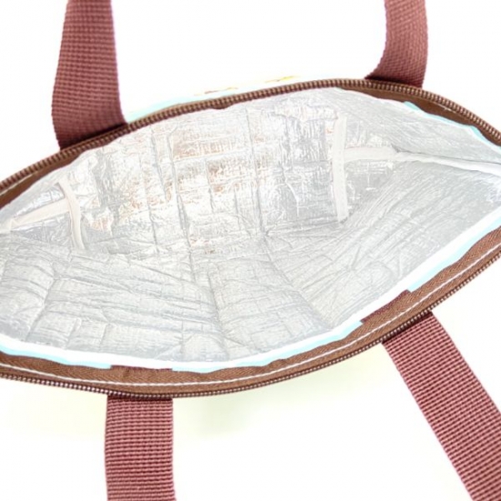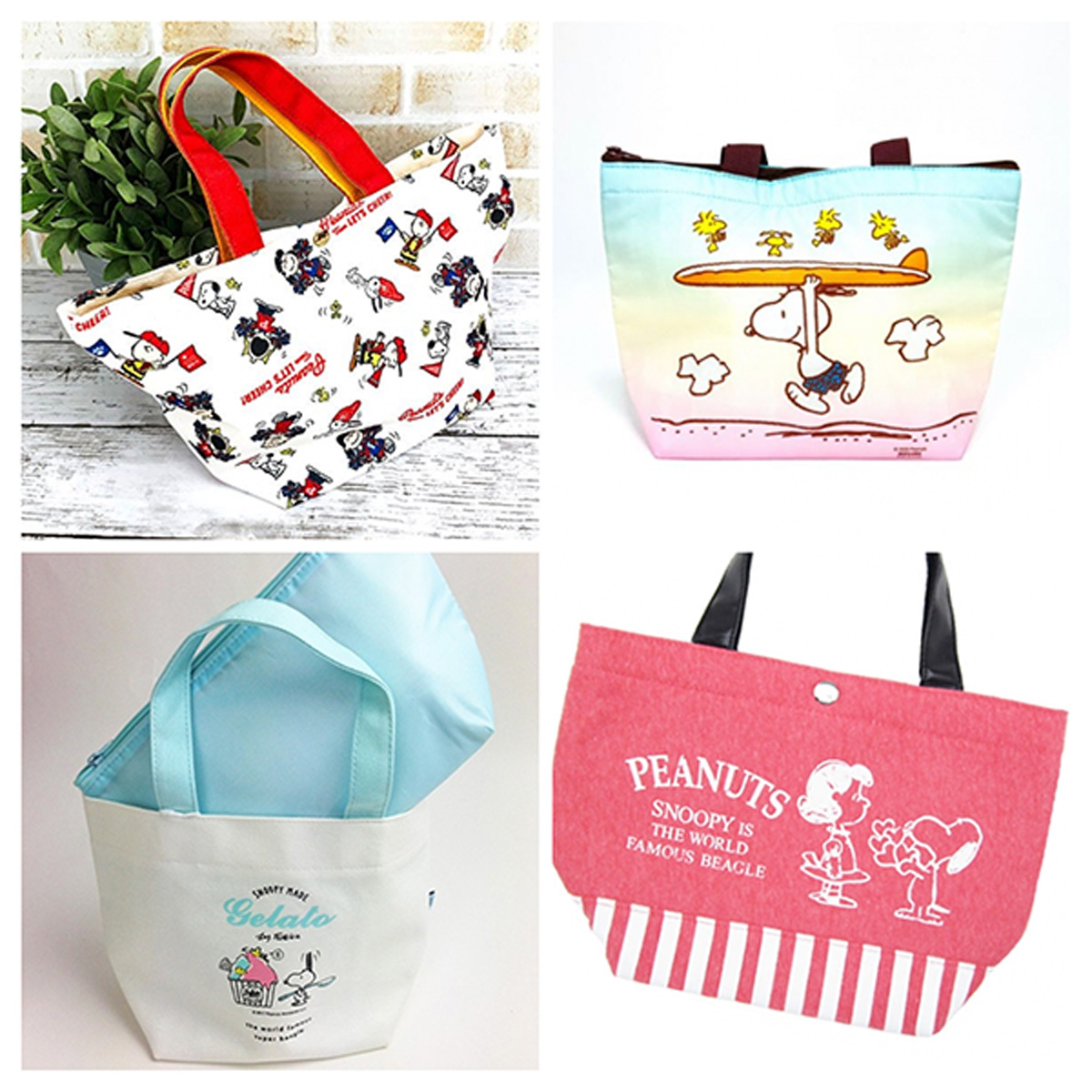 まずは、新商品のランチトートです。サーフィンデザインのスヌーピーがとっても楽しそうで、イチ押しです。内側がアルミ仕様なので、保冷&保温もできる優れもの。