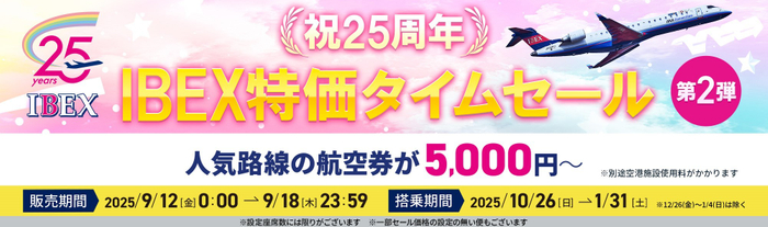 アイベックスエアラインズ株式会社(本社:東京都江東区、以下 IBEX)は、2025年10月26日~2026年1月31日ご搭乗分が対象となる「祝25周年 IBEX特価タイムセール 第2弾」を実施します。