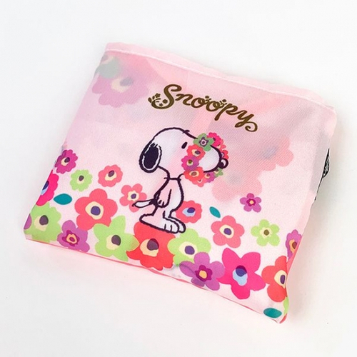 お花とスヌーピーの組み合わせがかわいい、フラワービーグルシリーズのエコバッグは収納袋が一体になったベーシックなタイプ。