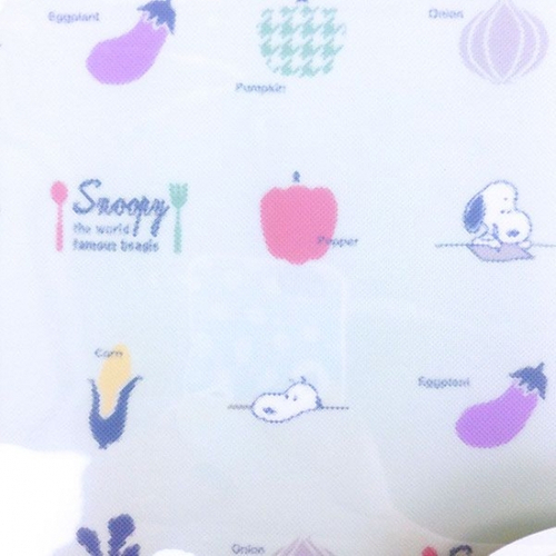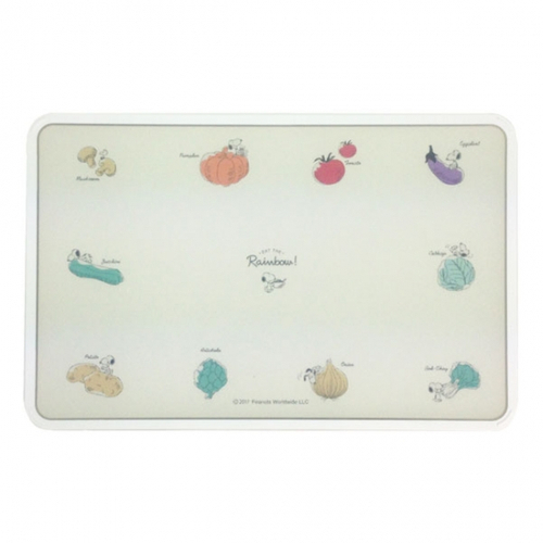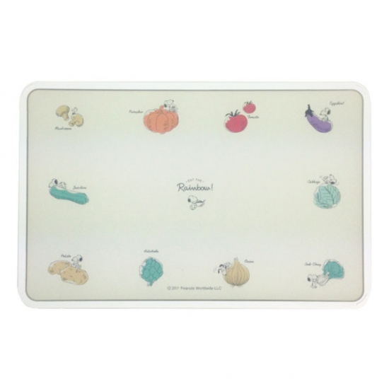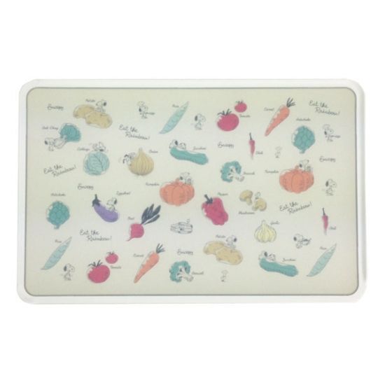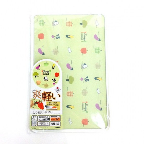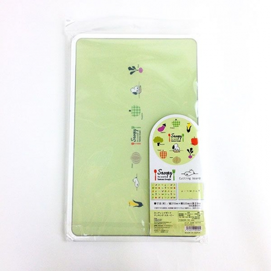 清潔感のあるグリーンのまな板はスヌーピーと野菜&フルーツ柄!表はフチにガードが付いて切ったものがこぼれません。