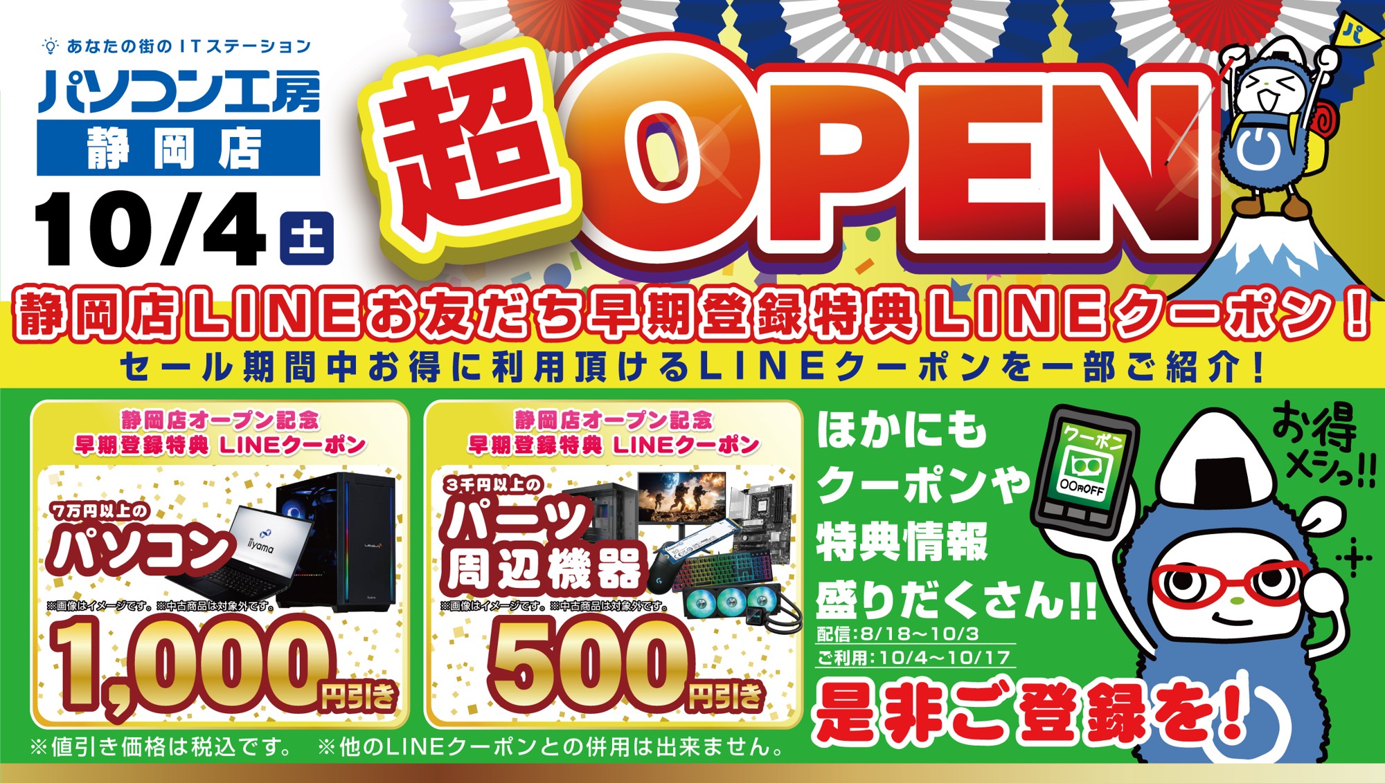 新規オープンを記念して、【パソコン工房 静岡店】公式LINEアカウントにお友だち登録いただいたお客様、ならびに静岡県にお住まいでパソコン工房WEB会員またはビジネスご優待会員に登録いただいたお客様を対象として、対象期間中のお買い物でお得にご利用いただけるLINEクーポン、WEBクーポンを配布いたします。