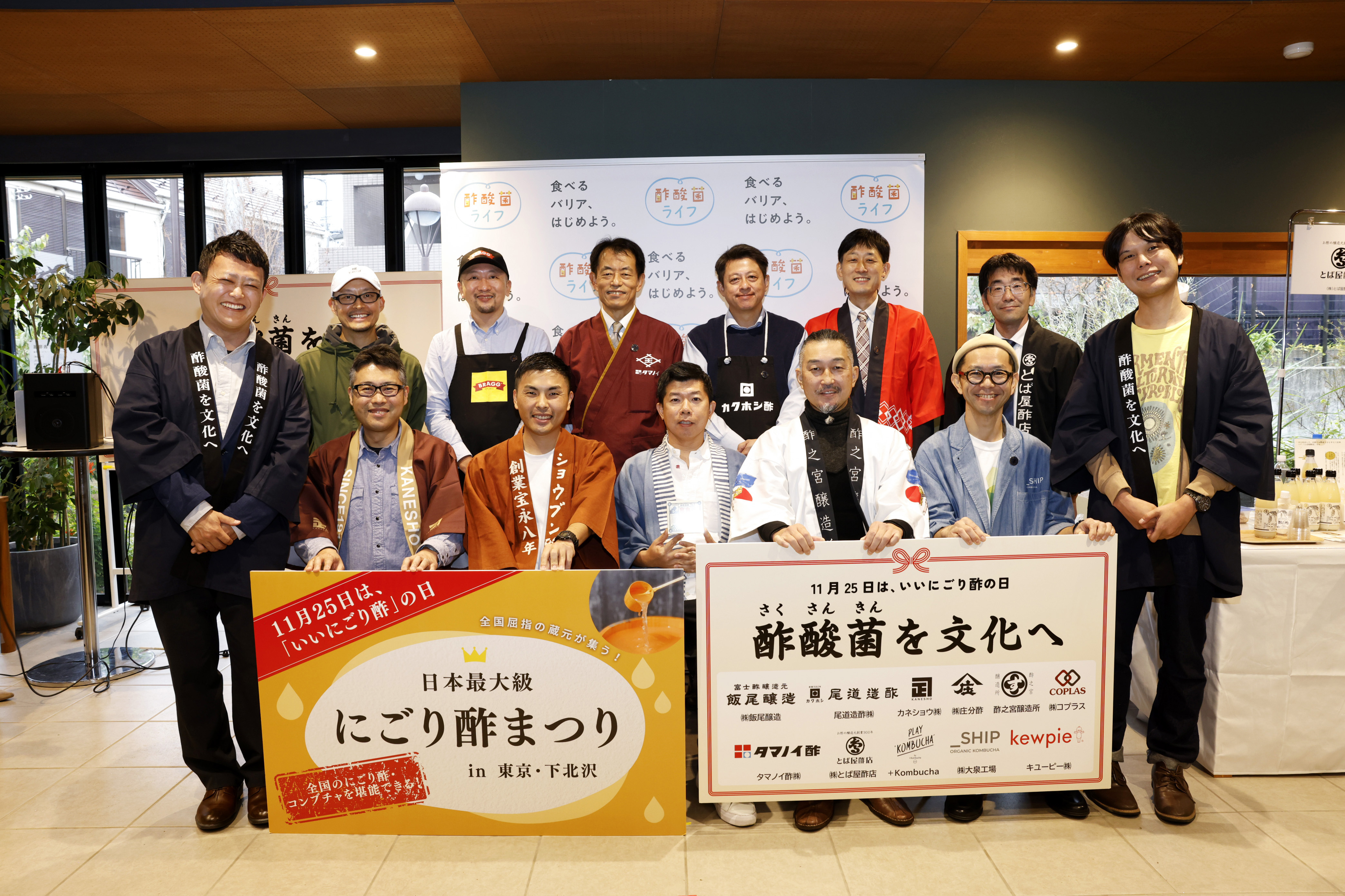お酢づくりの命であり、にごり酢やコンブチャに含まれる「酢酸菌(さくさんきん)」の健康価値や日常での取り入れ方等について情報発信を行う「酢酸菌ライフ」は、11月25日の“いいにごり酢の日”に合わせ、酢酸菌にごり酢の復刻に立ち上がった全国の蔵元やコンブチャメーカー計11社が初めて集結する日本最大級の体験イベント「にごり酢まつり」を、東京・下北沢で開催しました。当日は150名を超えるメディア関係者・一般生活者が来場し、にごり酢やコンブチャの飲み比べを通して、その豊かな味わいを体感。酢酸菌を共通のテーマに、企業の垣根を越えた取り組み、業界としても新たな一歩となる催しとなりました。