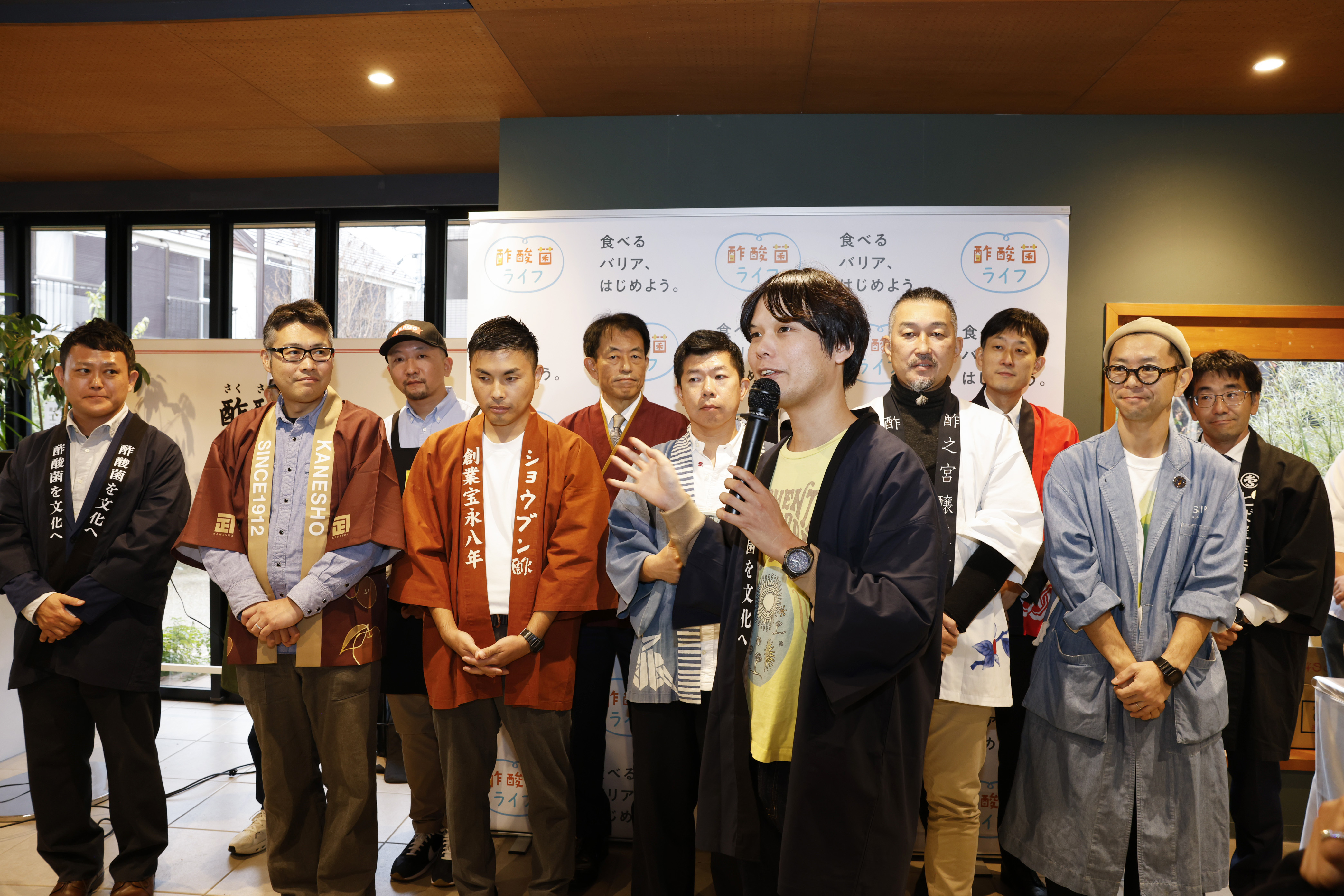 開会セレモニーでは、発酵デザイナーであり「発酵デパートメント」のオーナーを務める小倉ヒラク氏と、酢酸菌ライフを代表して、キユーピー株式会社の奥山氏が挨拶を行い、その後、全国の蔵元・コンブチャメーカー11社が横並びで登壇しました。