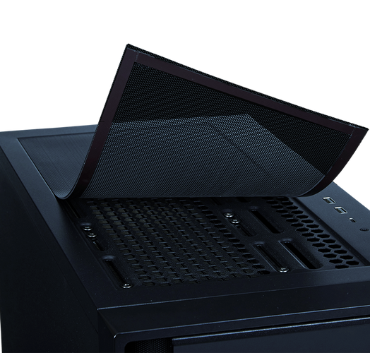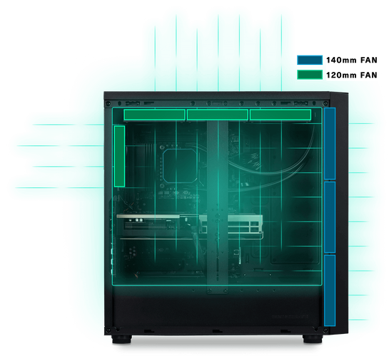 フロントに140mmの大型ファン3基、リアに120mmファン1基を標準搭載しています。 内部のパーツを効率よく冷却するために、フロント吸気、トップ・リア排気を採用し、強力なエアフローを実現します。