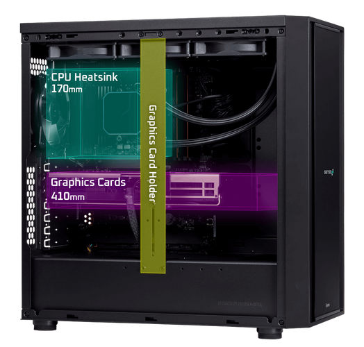 広々とした内部構造は最大410mmのグラフィックスカードを搭載可能とし、グラフィックスカードホルダーでしっかり支えることでズレや脱落を防止します。