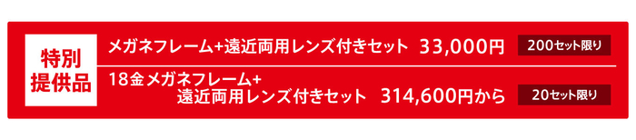 メガネフレーム+遠近両用レンズ付きセット33,000円均一を、200セット限りにてご用意いたします。また、18金メガネフレーム+遠近両用レンズ付きセットを314,600円から20セット限りにてご用意いたします。紫外線対策はもちろん、飛沫感染予防にもおすすめです。