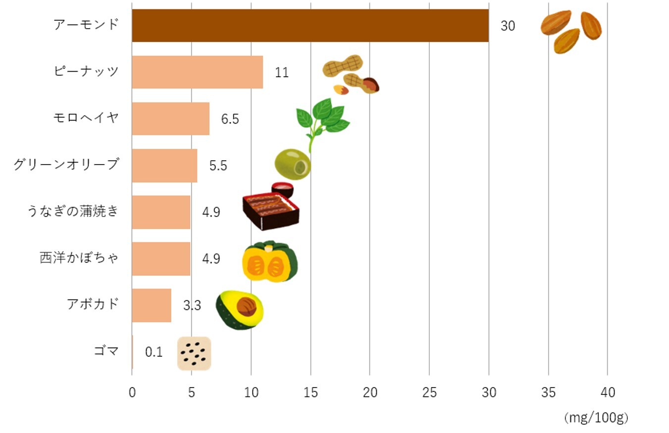 「天然のサプリメント」とも呼ばれるアーモンドには、ビタミンやミネラル、食物繊維などが豊富に含まれています。なかでも、ビタミンEの含有量は、うなぎやアボカド、かぼちゃなど他の食品と比べてもトップクラスです。