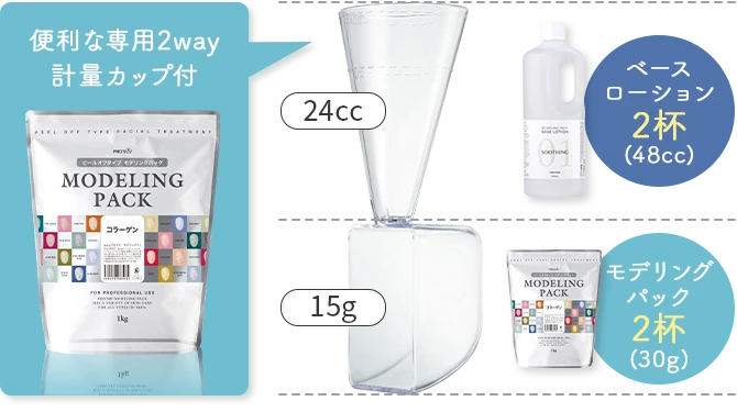モデリングパックに付属する専用2way計量カップで、モデリングパック2杯(30g)、ベースローション2杯(48cc)をボウルなどに入れ混ぜるだけで、簡単にお客様の肌に合わせたオーダーメイドパックが完成します。