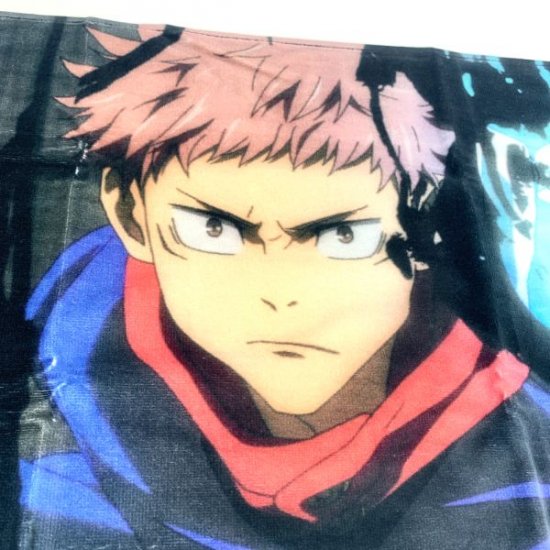 おつぎは呪術廻戦の主人公、虎杖悠仁デザイン♪迫力ある表情がかっこいいですよね。やっぱりお部屋にもかざりたくなる美麗さです。本気のスポーツのお供にいかがでしょうか?どこからか「生き様で後悔はしたくない」と聞こえてきそうなそんなタオルに仕上がっています!