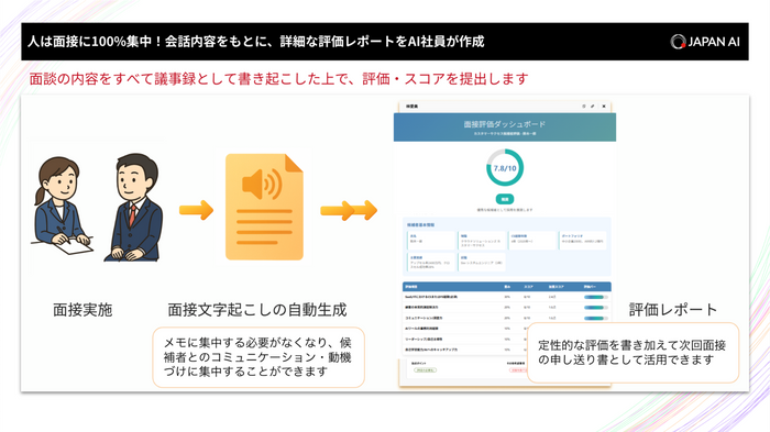 面接内容を自動で文字起こしをして選考基準に基づいた面接評価レポートを自動で作成します。