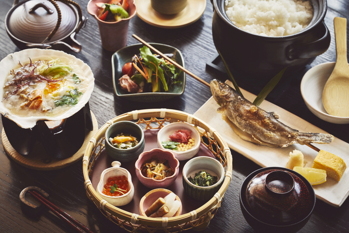 「古民家のふるさと御膳」は、かやぶき屋根から朝日が差し込み、かつて人と馬が共存していた面影が残る古民家の空間で提供する特別朝食です。ほたての貝殻を鍋代わりにほたてや旬の食材を煮込んだ郷土料理「味噌貝焼き」や、囲炉裏で焼いた魚、土鍋で炊いたご飯など、青森の郷土料理を中心に用意しています。