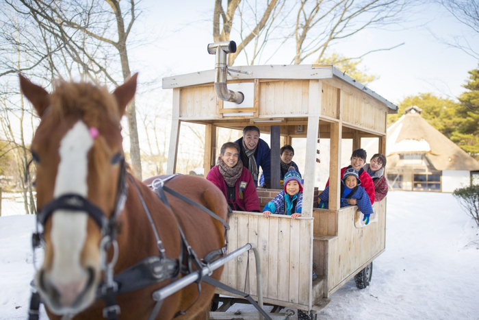 青森はかつて名馬の産地と呼ばれ、馬を家族のように大切にしてきた文化を知ってもらうため、青森屋では季節ごとに馬車を運行しています。冬は、馬車内に薪ストーブを取り付け、あたたまりながら公園を巡る「ストーブ馬車」を運行します。馬と触れ合いながら、本物の馬の大きさや力強さを知ることができます。