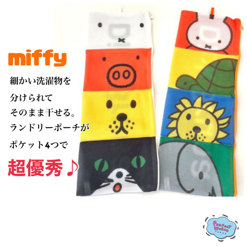 ミッフィーの4ポケランドリーポーチです!ミッフィーといろんな動物がデザインされていて、見た目だけでもすごく可愛いですよね♪こんなにカラフルなランドリーポーチなら毎日のお洗濯も楽しめそうです。