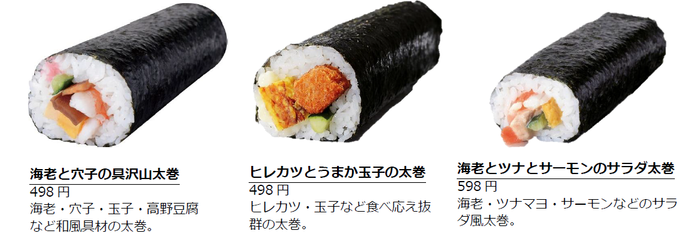 近畿圏ではきゅうり・かんぴょう・玉子・しいたけ・高野豆腐などこだわりの具材を使用した「うまか太巻」など最大24種類の恵方巻を、首都圏では北海道産帆立やまぐろなど8種の具材を使用した「北海道産帆立入り海鮮太巻」など最大10種類の恵方巻をバリエーション豊富に取りそろえます。