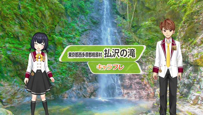 翔愛学園の生徒になって楽しむ学園生活コミュニティ『キャラフレ』では、全国各地の観光地や観光施設とタイアップをおこない、実在する風景やお店などを紹介しています。今回は2017年から公開している「東京都西多摩郡檜原村」にある、日本百名滝のひとつ「払沢の滝」をアップデートし、水流を再現するシネマグラフ機能の実装と、周辺のお店の紹介を追加しました。