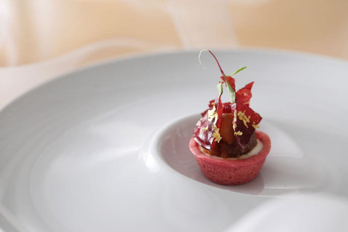 紅玉林檎のキャラメリゼとブレザオラ ビーツとサワークリームのタルトレット