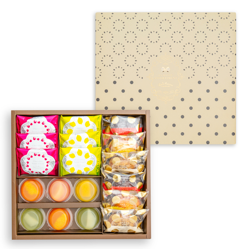 国産フルーツのジュレや、しっとり食感のマドレーヌ、果実を入れた焼きショコラをサンドしたサクサククッキーなど、ラ・メゾン人気の焼き菓子が楽しめる夏限定アソート。