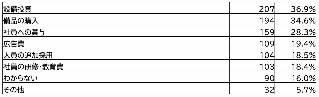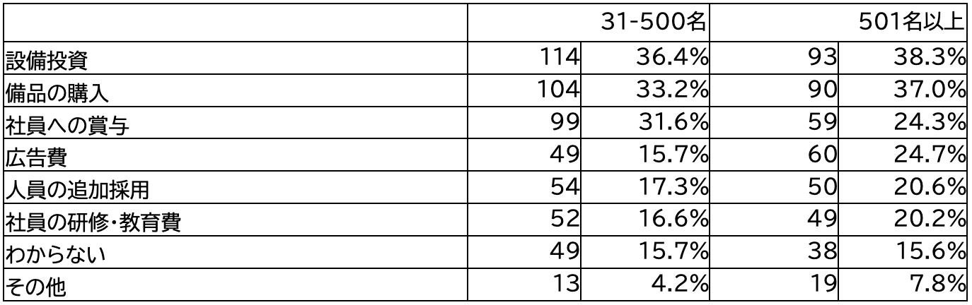 また従業員規模別で見ると、501名以上の企業では「広告費」、500名以下の企業では「社員への賞与」を採用する割合がもう片方と比べ高い傾向となった。