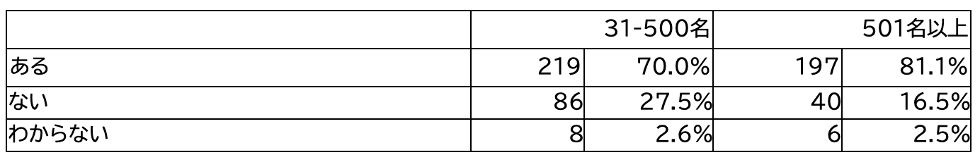 また従業員規模別で見ると、「ある」と答えた割合は31-500名規模の企業では70.0%、501名以上の企業で81.1%と、大企業の方が多い傾向となった。