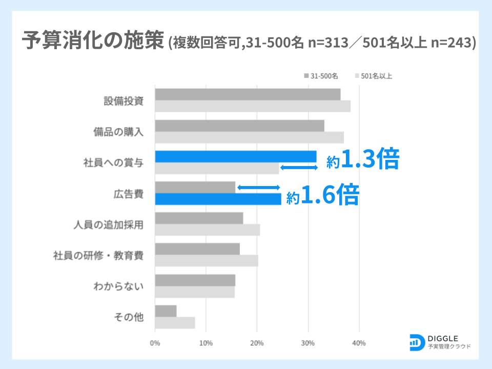 ・予算消化の施策としてもっとも多いのは「設備投資」で36.9%。従業員規模別で見ると、501名以上の組織では「広告費」、500名以下の組織で「社員への賞与」の割合が高い