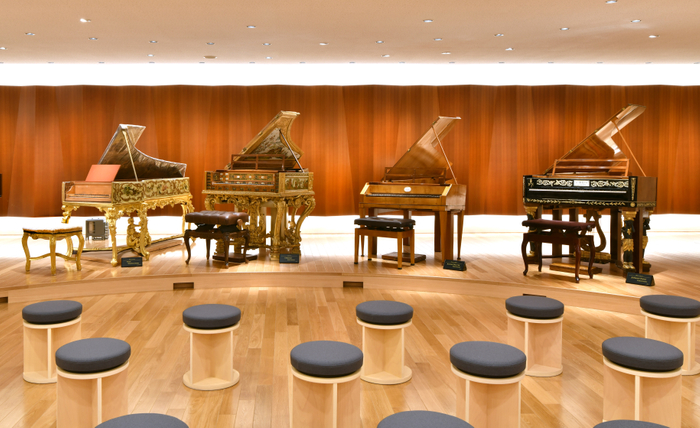2階古典ピアノ室には、1580~1600年頃製作されたピサ・チェンバロ(写真右)をはじめ、ベートーヴェンの弟子ケーグレビッチ伯爵令嬢バルバラが所持していた「トルコ式ペダル」を備えるヨハン・フリッツなど貴重な古典ピアノなどの音色を、実際に聴いて楽しむことができます。