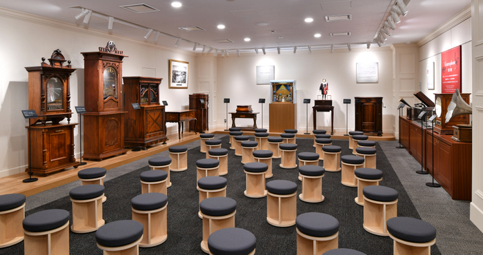 1885年に製作されたシリンダー型オルゴール、チューブラーチャイムのついた「ロッホマン・オリジナル・モデル172MW」などのディスク型オルゴール、100年以上前に製作されたビクター社の「ビクトローラVV-16型」の蓄音機などのコレクションを展示しております。