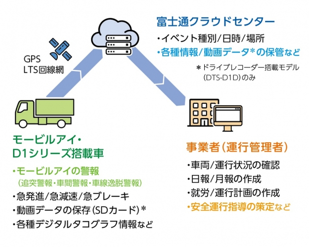 トランストロン社製品との連携は、先モデルのC1シリーズとの連携に続くものです。D1シリーズは、LTE高速通信網(富士通専用回線)を利用したネットワーク型で、車両動態管理やデジタコ機能を用いた業務管理、さらにドライブレコーダー搭載モデルでは、記録された動画による運転支援機能も活用でき、運行状況の透明化や労働生産性の向上も期待できます。これら機能に加え、モービルアイとの連携により「追突警報」「車間警報」「車線逸脱警報」をリアルタイムで把握・記録することが可能となります。今までのGセンサーを使用したイベント記録では把握が難しかった車間の取り方や、過労・居眠りによるふらつきといった運転挙動を記録することで、ドライバーの運転状況が把握できます。