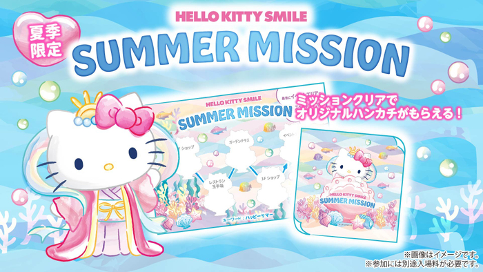 内容:HELLO KITTY SMILEの5つのエリア内にいるスタッフに合言葉「ハッピーサマー」をお伝えいただくと限定ステッカーをお渡しします。全5種類の限定ステッカーを全て集めると、本イベント限定デザインのハンドタオルをプレゼント ※無くなり次第終了
