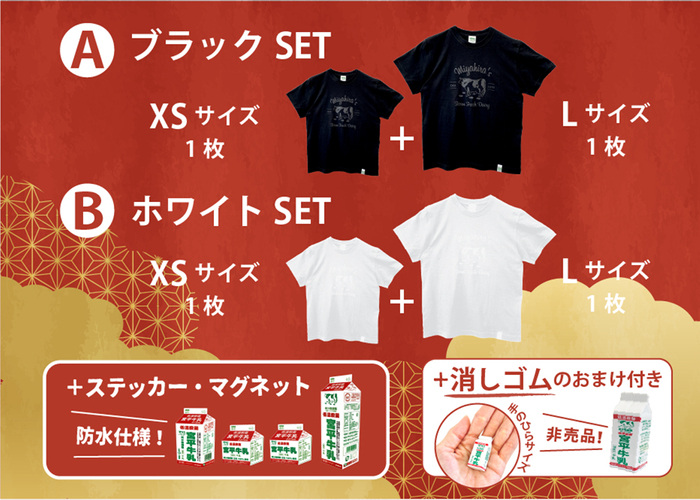 牛乳愛を大胆に表現した473mlTやかわいい手書きの牛乳をあしらった237mlT、シンプルイズベストの2023T、の中から各サイズ2枚をチョイス※ いたします。