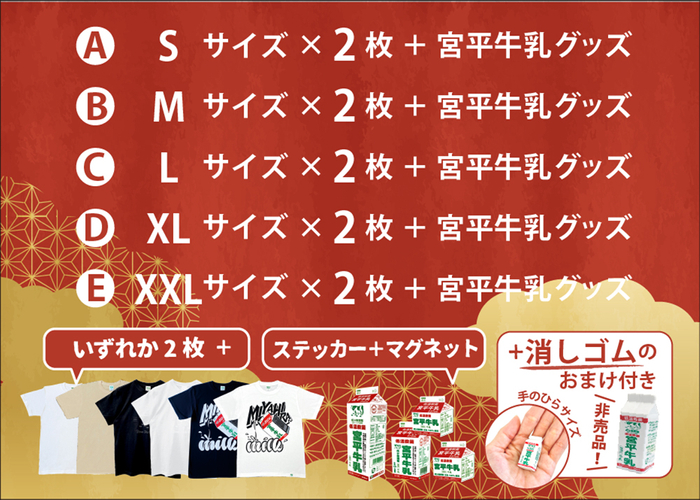 ▪️宮平Tシャツ各サイズ 2枚+宮平牛乳ステッカー 大中小 各1枚+宮平牛乳マグネット セット 8,420円〜9,300円 → 6,000円!